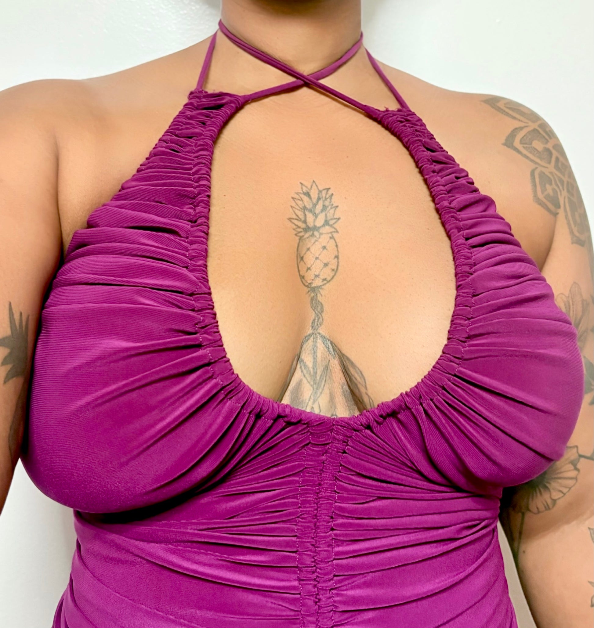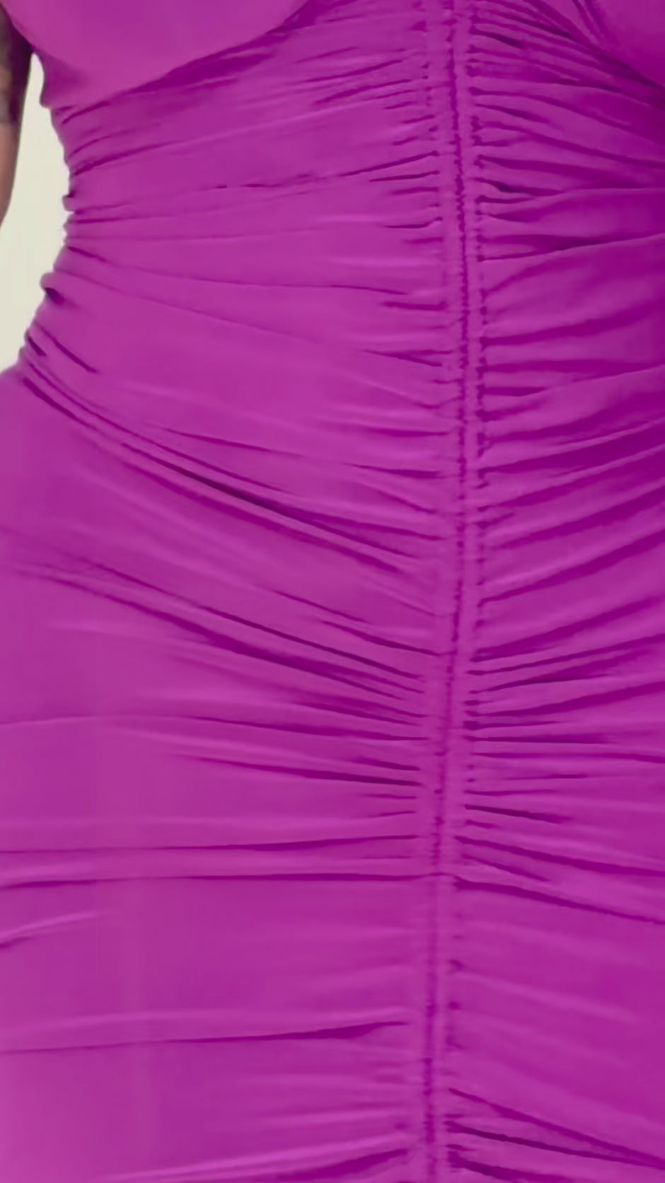 Turn heads in our Sexy Purple Ruched Dress, the ultimate statement piece for nights out, parties, and special occasions. This stunning halter bodycon midi dress features a daring deep V-neckline that highlights your curves, while the flattering vertical ruching creates a sleek, slimming effect.
