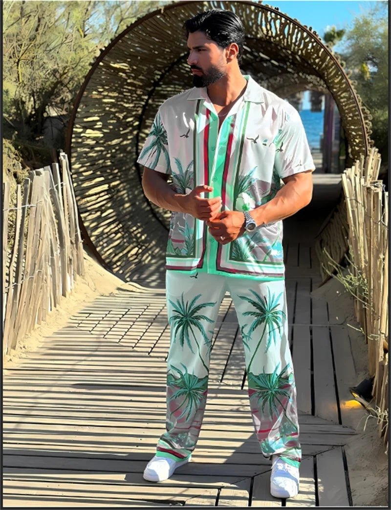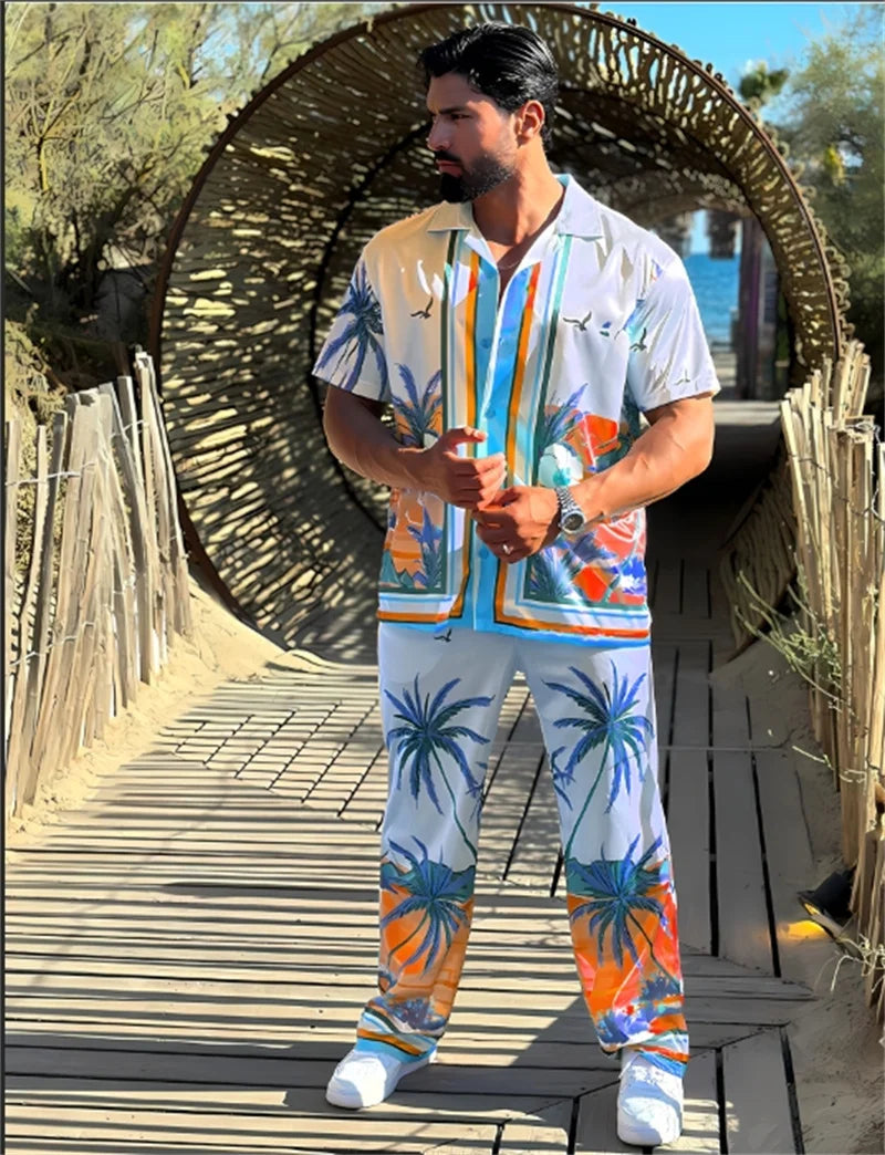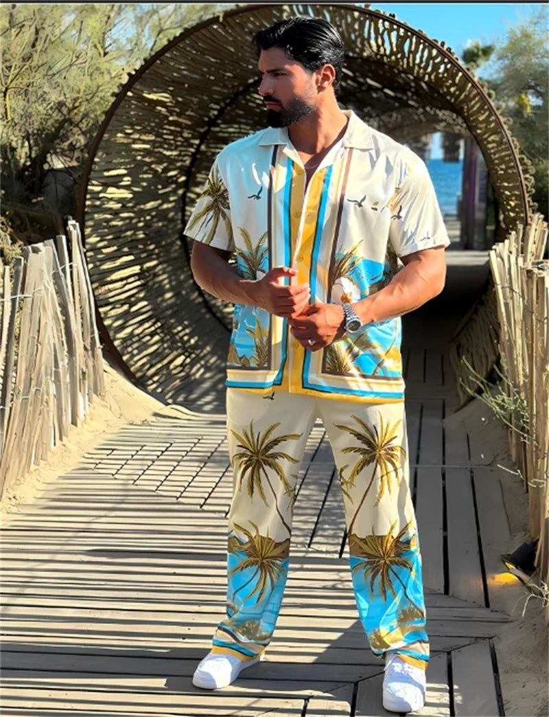 Vacation style men's lapel print casual pants set